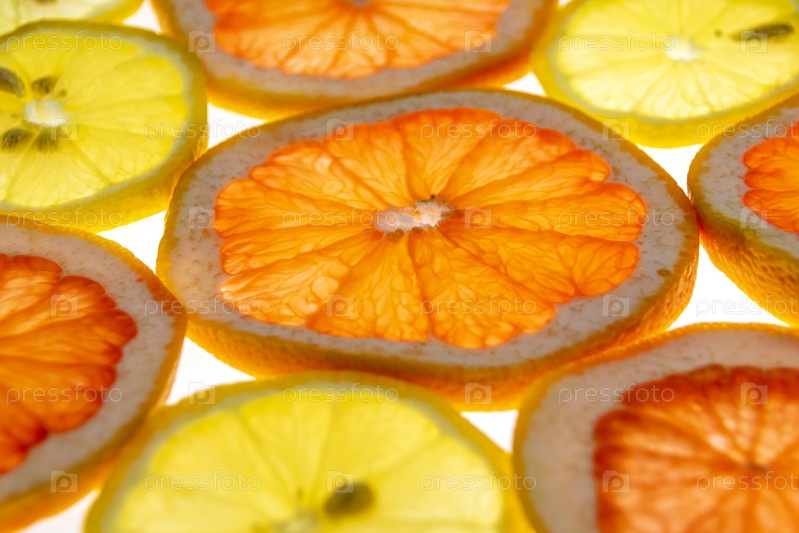 Ломтики лимона и грейпфрута на белом фоне на просвет