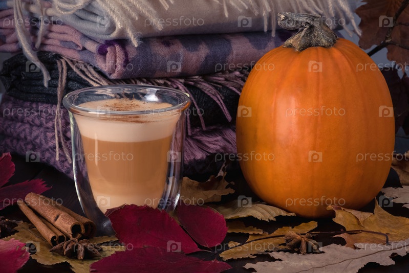 Термостойкая стеклянная чашка с тыквенным латте и подставкой из спелой тыквы на столе