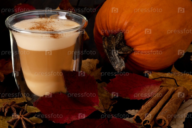 Термостойкая стеклянная чашка с капучино или латте и спелой тыквой