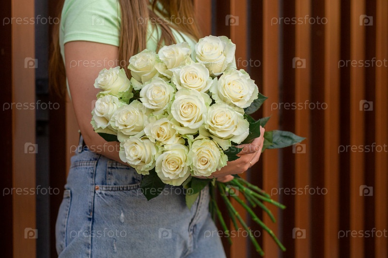 Женщина держит роскошный букет свежих белых роз на фоне кирпичной стены. Моно букет белых роз в женских руках