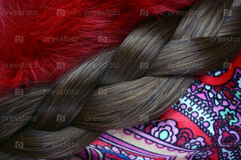 Волосы, заплетенные в косу, лежат на шапке в русском стиле