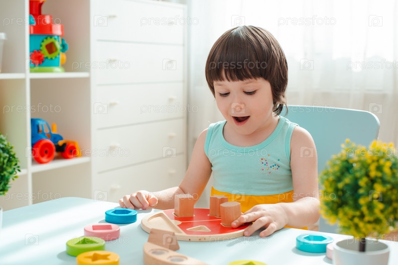 Маленькая девочка собирает деревянную неокрашенную пирамиду. Безопасные детские игрушки из натурального дерева