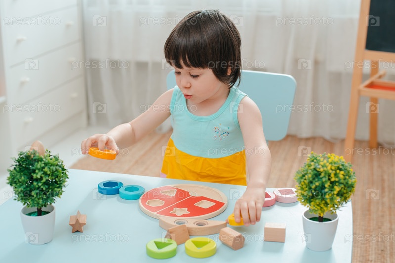 Маленькая девочка собирает деревянную неокрашенную пирамиду. Безопасные детские игрушки из натурального дерева