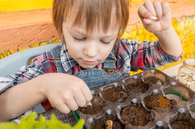 Мальчик сажает тыквенные семечки в торфяные таблетки в мини-теплице