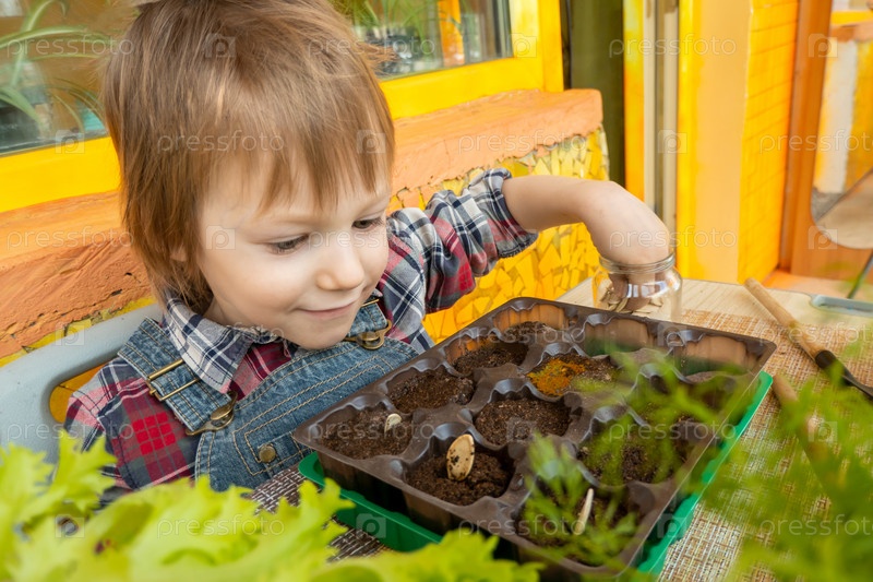 Мальчик сажает тыквенные семечки в торфяные таблетки в мини-теплице