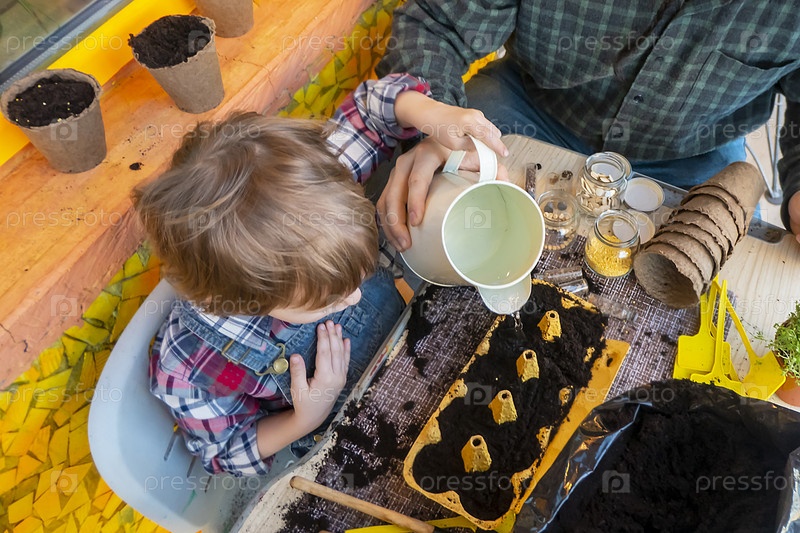 Ребенок поливает семена, посаженные в кассеты из яиц