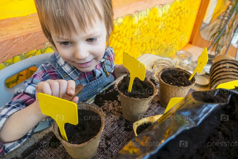 Мальчик ставит маркеры и подписывает посаженные растения