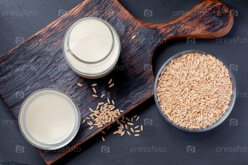 Безмолочное овсяное молоко в стеклянной бутылке и семена стекла и овса в стеклянной миске на деревянной кухонной доске на сером фоне