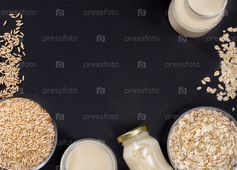 Темно-серый фон с рамой из стеклянных мисок с семенами овса и хлопьями и стеклянными контейнерами с овсяным молоком