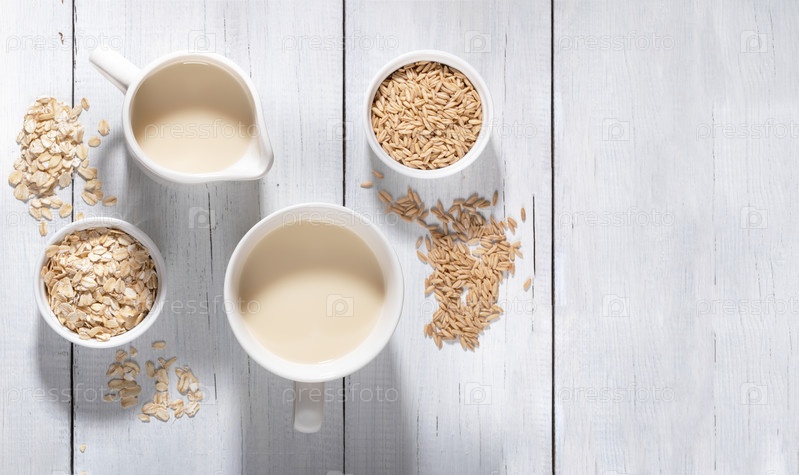 Белые миски с семенами овса и хлопьями и белые кружки с овсяным молоком на белом деревянном фоне
