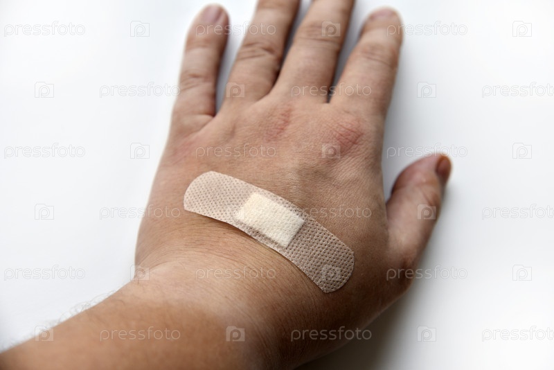 Медицинский пластырь на руке мужчины на белом фоне. Желтое пятно на ране на руке