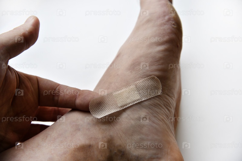 Нашивка на белой ноге мужчины. Заплата на ране ноги крупным планом