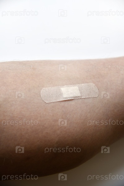 Нашивка на белой ноге мужчины. Заплата на ране ноги крупным планом