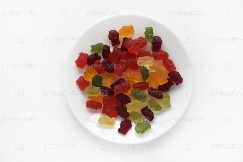 Мармеладно-желатиновые сладкие мишки на белой тарелке. Вкусные мармелады на белом фоне