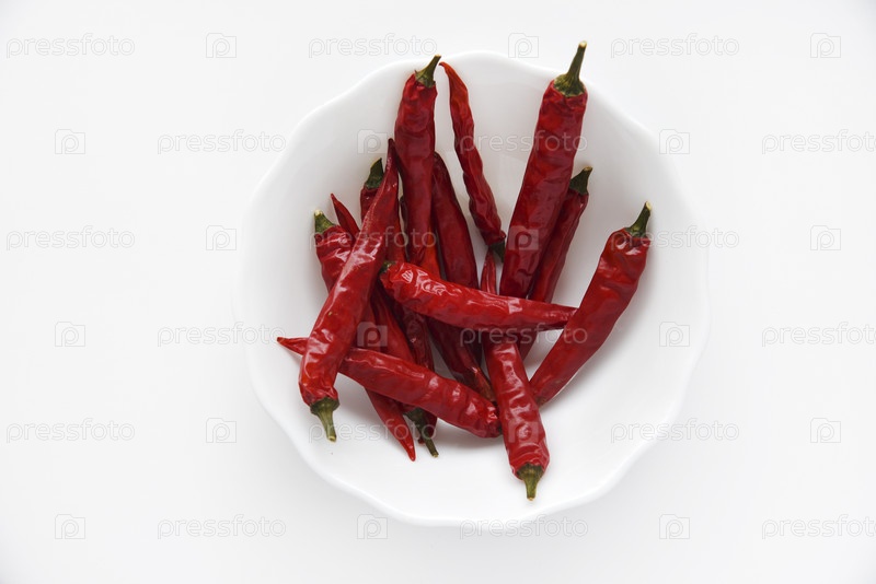 Красный острый стручковый перец в белой миске. Острый красный перец в тарелке крупным планом на белом фоне