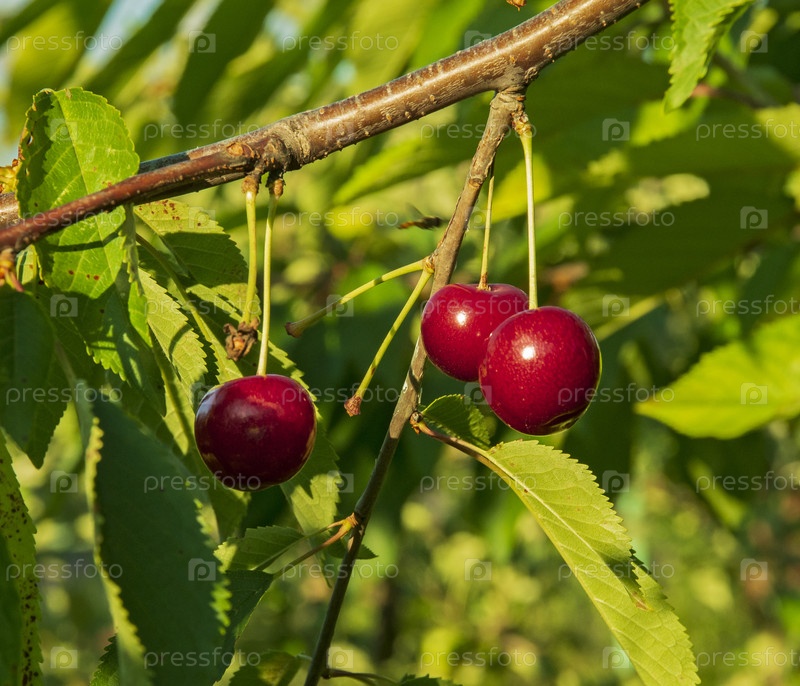 Спелые плоды вишни на ветке дерева