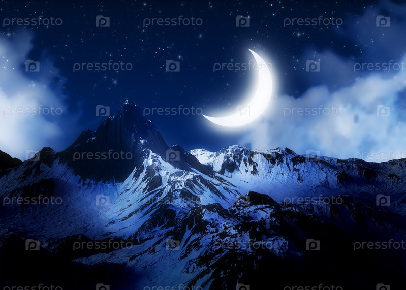 3D ночь снежные горы и луна