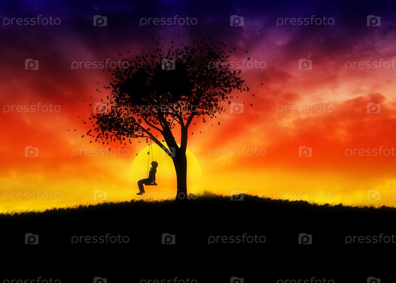 Девушка на качелях под деревом на закате