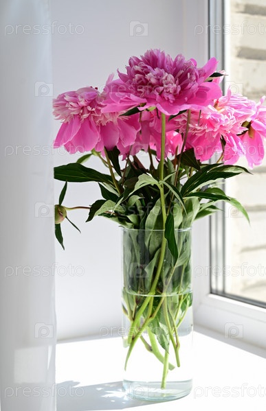 Вид на букет розовых пионов, стоящих в вазе на окне. Концепция фона, цветы, праздник