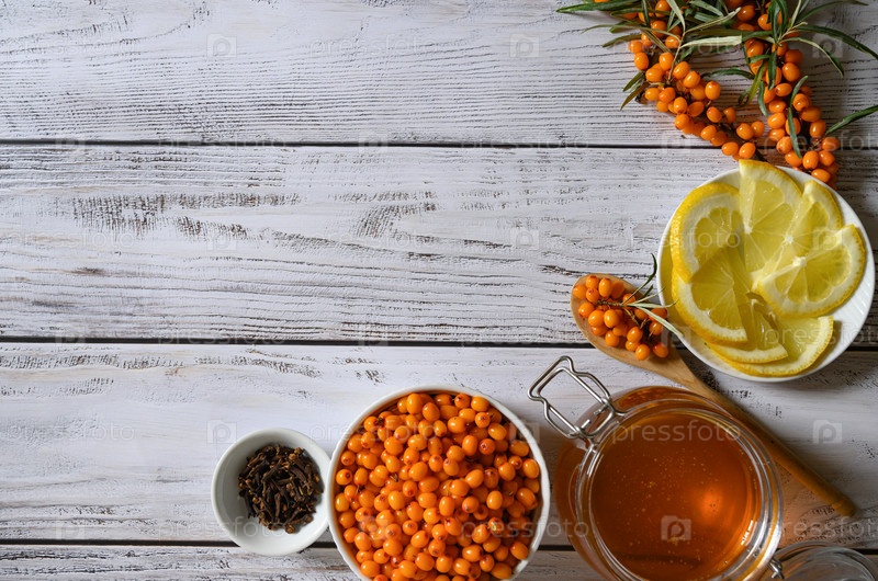 Ягоды облепихи, мед, лимон, корица. Витаминизированное питание. Забота о здоровье