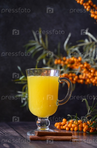 Чай из ягод облепихи с веткой на темном деревянном фоне