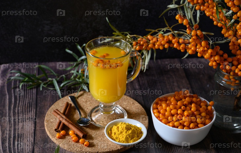 Чай из ягод облепихи с веткой на темном деревянном фоне