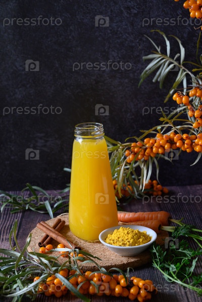 Чай из ягод облепихи с веткой на темном деревянном фоне