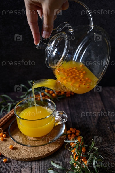 Чай из ягод облепихи с веткой на темном деревянном фоне