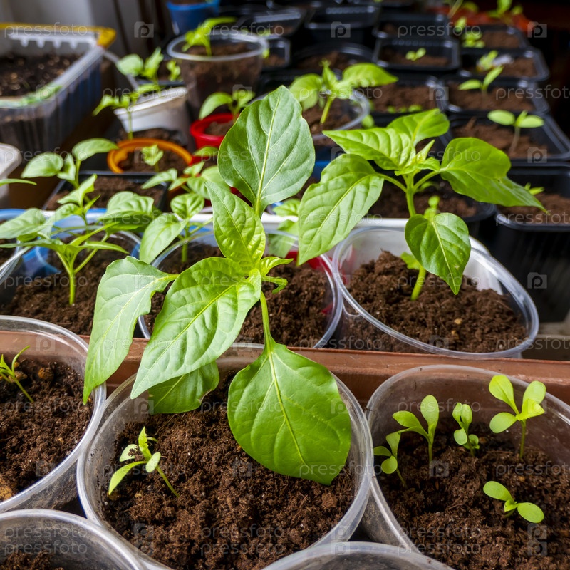 Рассада растет в горшке дома. Проросшие саженцы высаживают на черный поддон и поливают из лейки