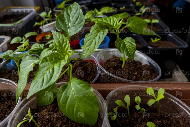 Рассада растет в горшке дома. Проросшие саженцы высаживают на черный поддон и поливают из лейки