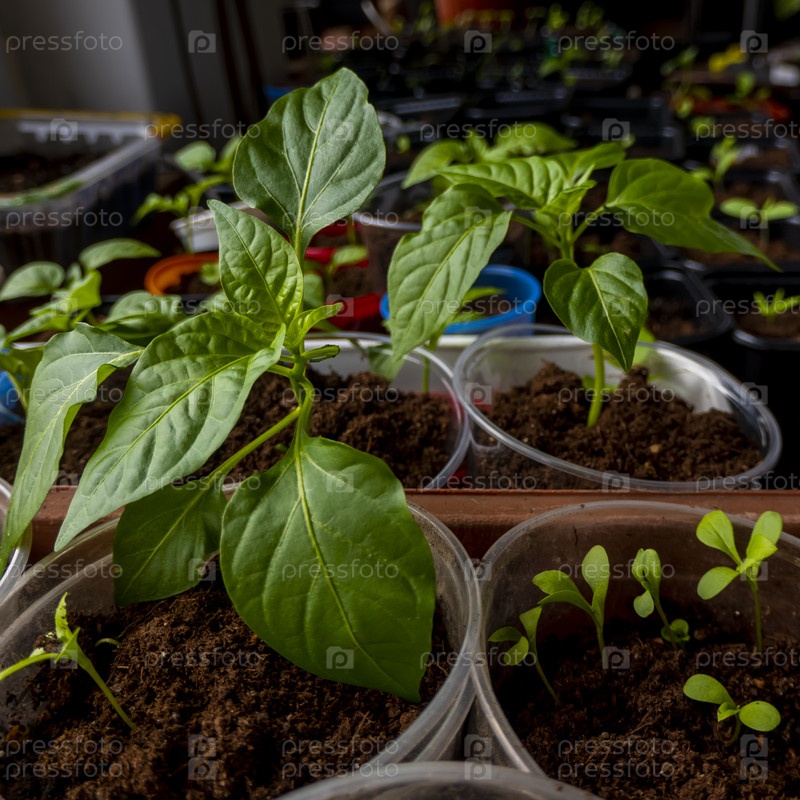 Рассада растет в горшке дома. Проросшие саженцы высаживают на черный поддон и поливают из лейки