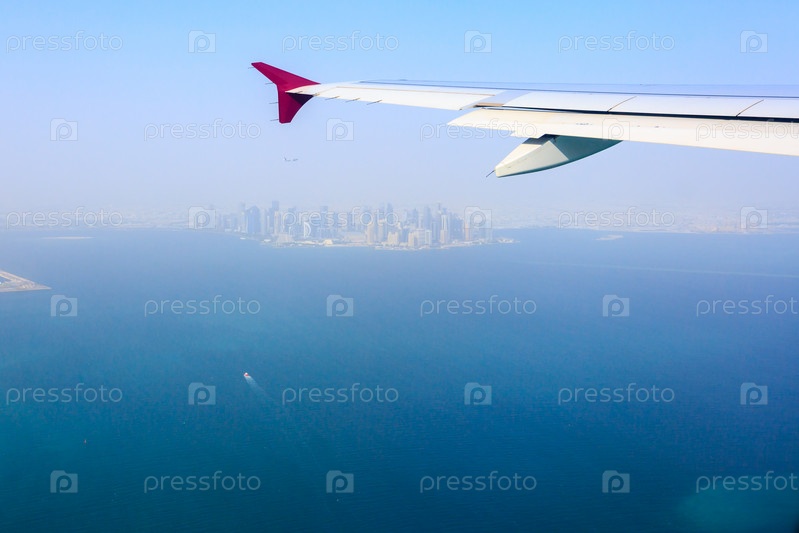 Самолет летит над небоскребами. Вид на город Доха, Катар, из иллюминатора самолета. Концепция путешествия