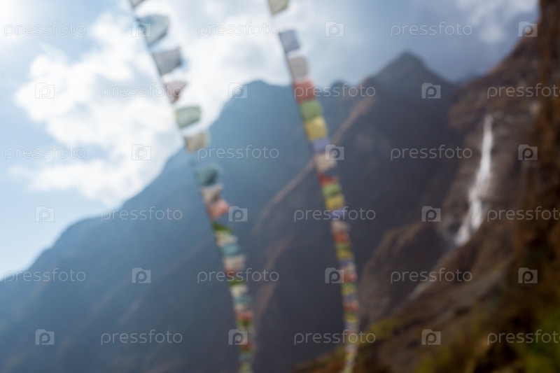 Размытый фон горы природы. Молитвенные буддийские флаги развеваются на ветру. Непал, Гималаи