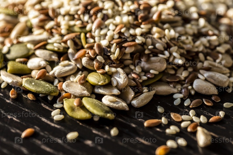 Смешанные сухие семена тыквы, кунжута, подсолнуха, льна для здорового питания на деревянном черном столе