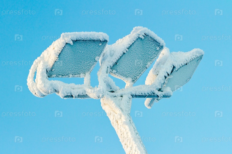Утренний зимний иней на уличной лампе на горнолыжном курорте Рука, Финляндия