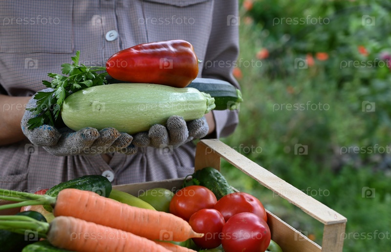 Женщина-фермер держит деревянный ящик, полный свежих сырых овощей. Корзина с овощами (морковь, огурцы, перец, яблоки, кабачки, петрушка) в ваших руках