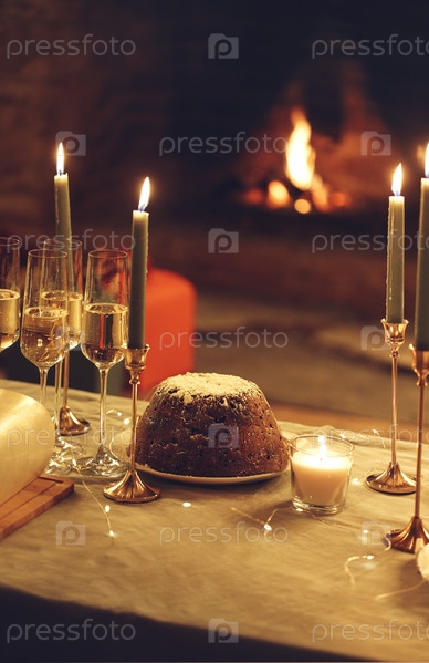 Романтическое уютное фото праздничного обеденного стола со свежеиспеченным рождественским тортом у камина