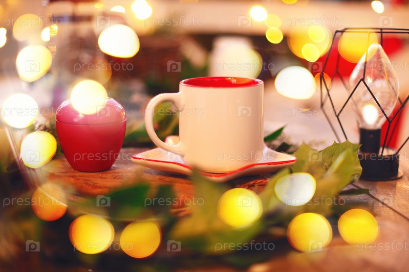 Белая чашка горячего зимнего напитка на размытом рождественском фоне с желтыми рождественскими огнями