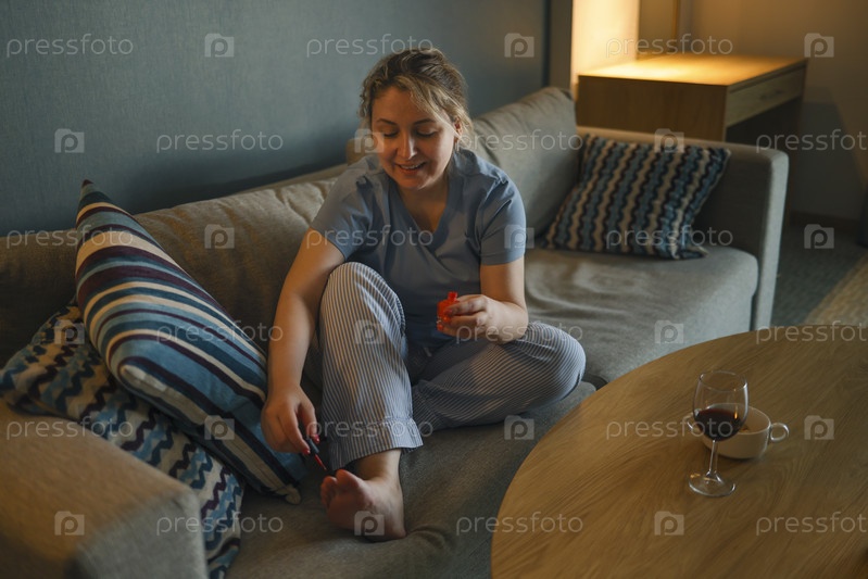 Молодая счастливая женщина использует пилку для ногтей, делая себе педикюр дома