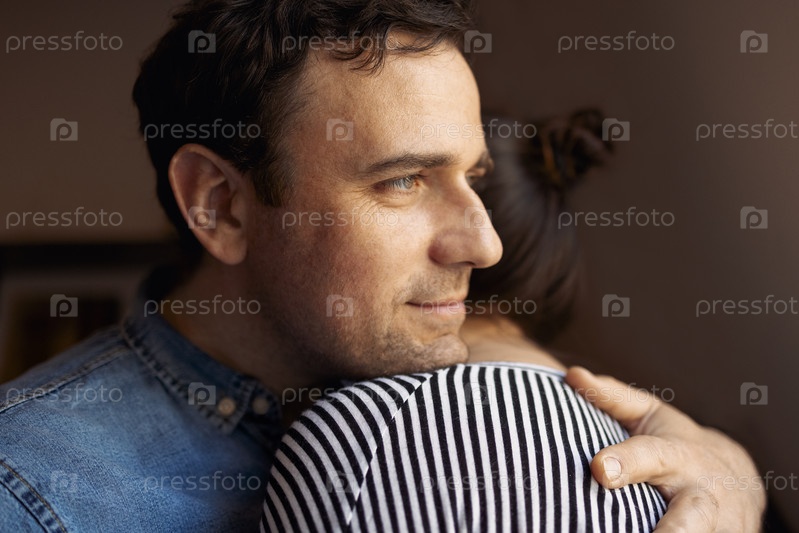 Обрезанное изображение красивой молодой пары брюнет. Любящий муж нежно обнимает жену