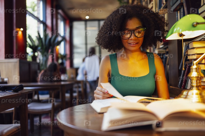 Счастливая афроамериканская студентка учится в университетской библиотеке