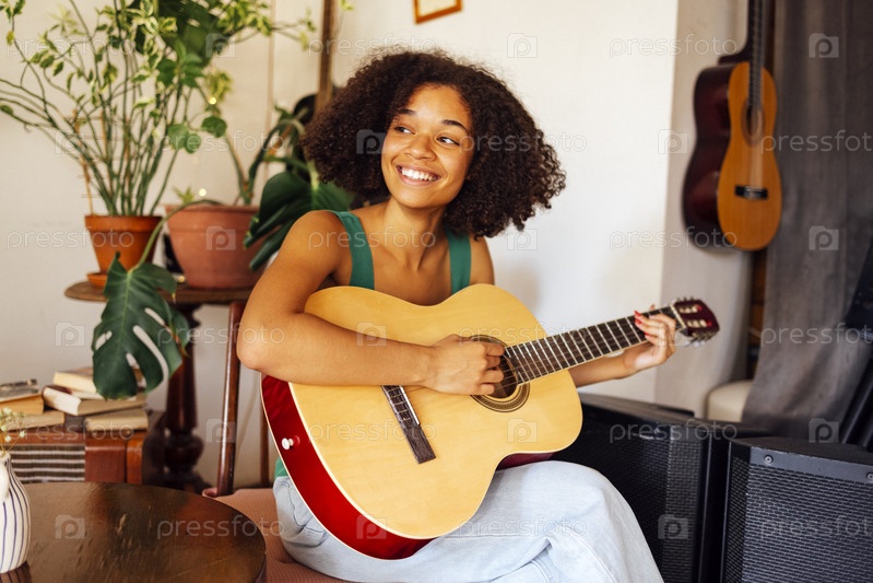Афро-американская молодая женщина играет на акустической гитаре