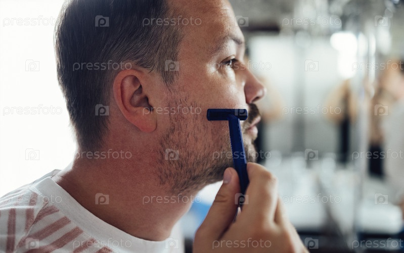 Тысячелетний красавец смотрит в зеркало, бреет лицо