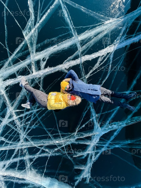 Счастливая пара на замерзшем зимнем озере Байкал