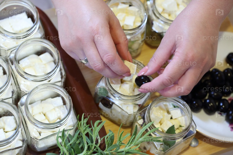 Женские руки заполняют банки с фетой и специями