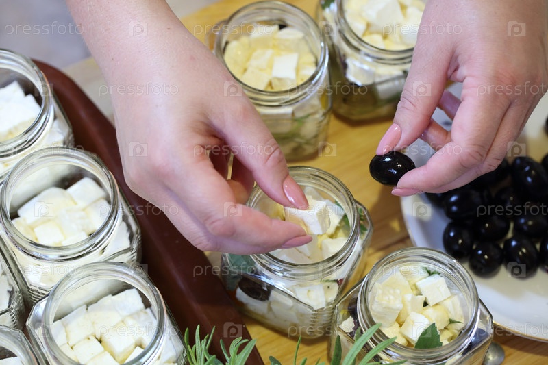 Женские руки заполняют банки с фетой и специями