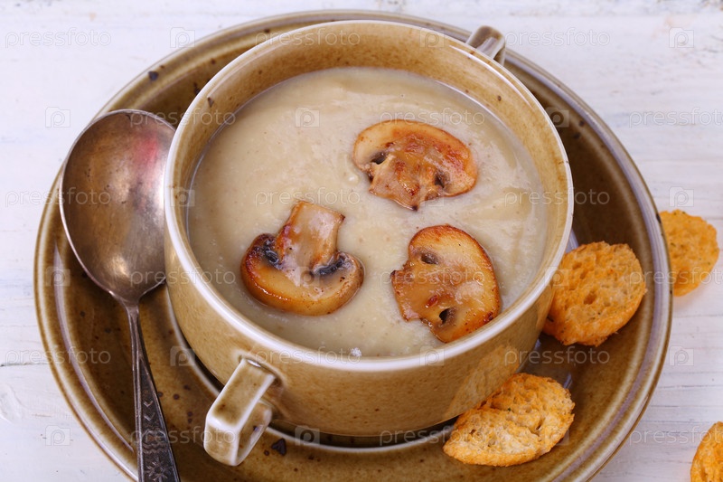 Суп-пюре с брокколи в бульоне из белого супа на деревянном фоне