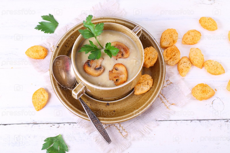 Суп-пюре с брокколи в бульоне из белого супа на деревянном фоне