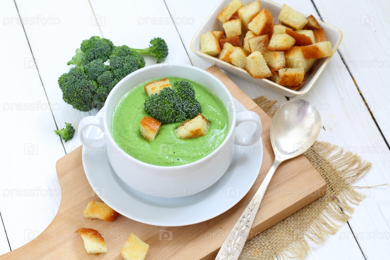 Суп-пюре с грибами и гренками на деревянном фоне