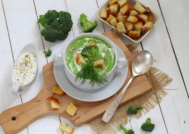 Суп-пюре с брокколи в бульоне из белого супа на деревянном фоне